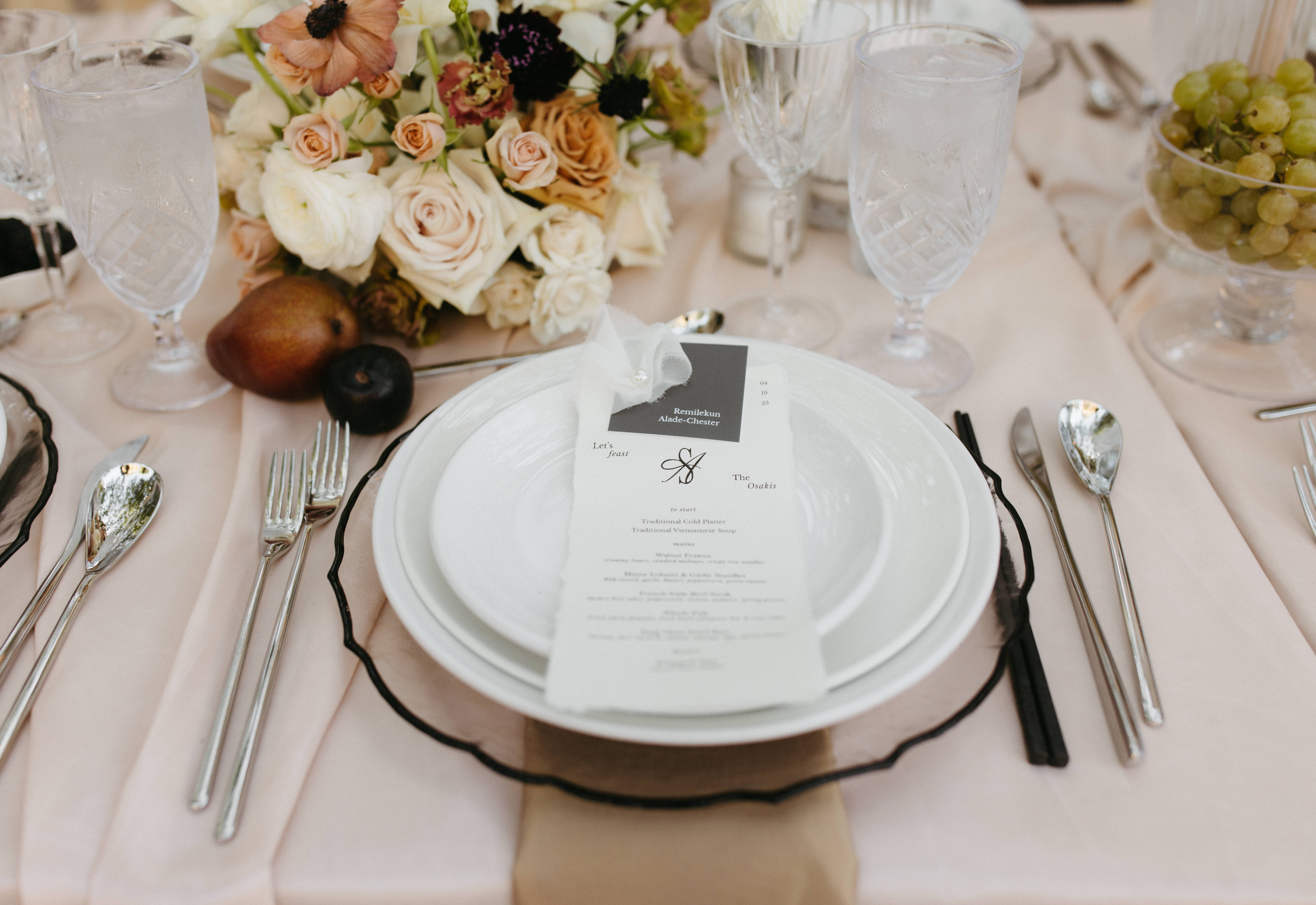 The final menu was printed on handmade, cotton-textured paper with naturally deckled edges, adding depth and romance to each place setting. The name tags were produced on thick stock, hand-assembled with chiffon ribbon and a pearl detail.